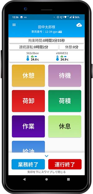 デジタコ連携 PLUSアプリとデジタコ本体のボタン操作が連動し、デジタコの入力補助装置としてご活用いただくことも可能になります。 ※有償オプション