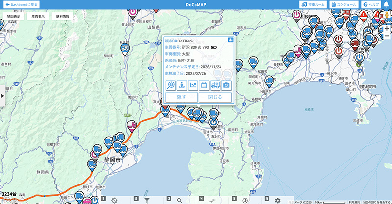 DoCoMAPでは、慣れ親しんだGoogleMaps上に車両の位置を表示し管理することが可能です。GoogleMapsの機能を利用して、渋滞情報やストリートビューなどの機能を直接利用することも可能です。